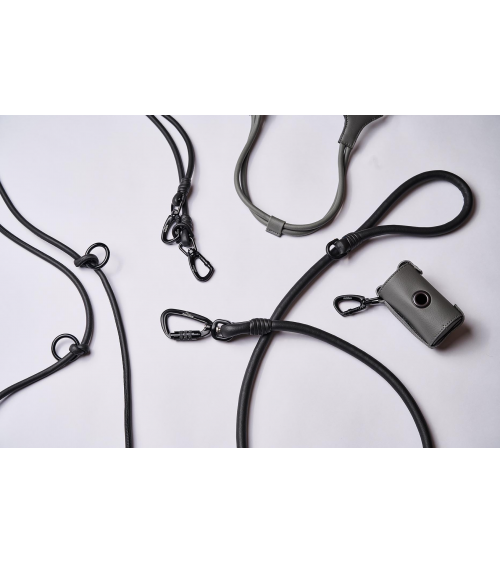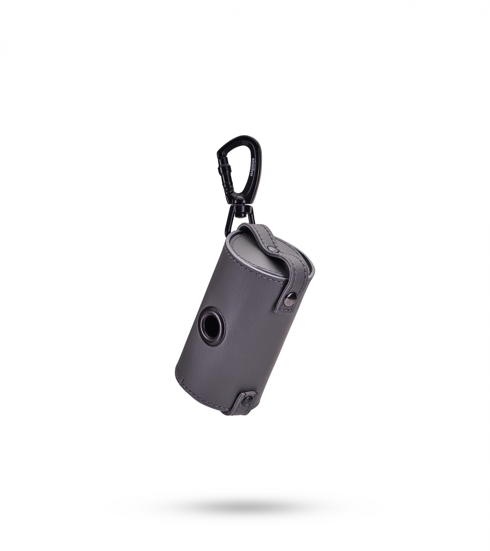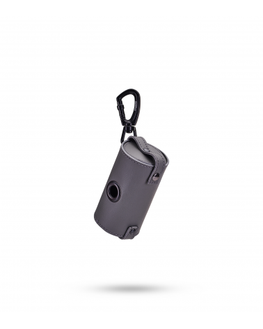 Cylindrical structure, made entirely of certified eco-leather, double opening accompanied by a small black climbing carabiner that makes the accessory versatile.