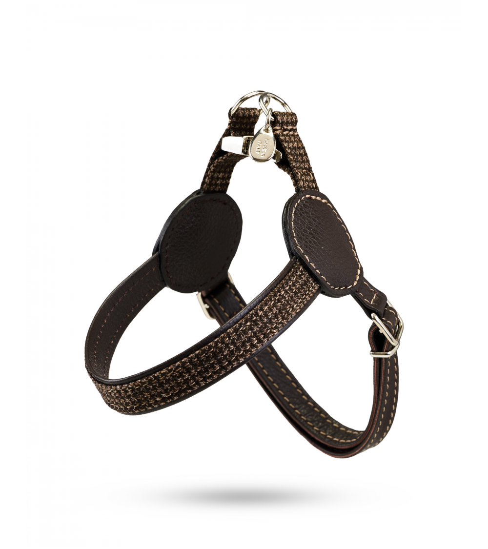 Structure made of soft wool/cotton blend fabric with a Pied de Poule pattern in dark brown. Lined and adjustable belly in soft Italian calf nappa leather. Contrasting ecru stitching. Ultra-light aluminum buckle, palladium-finish hardware.