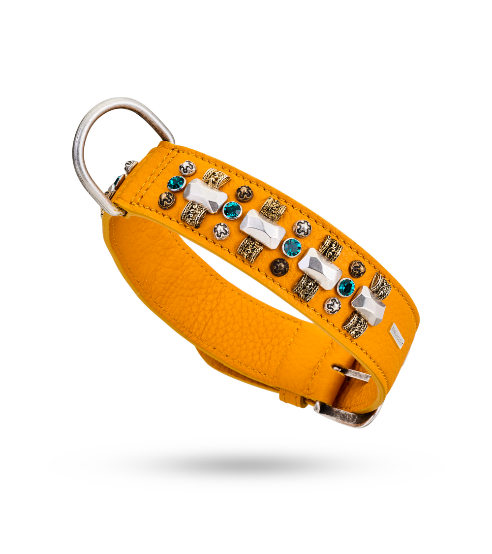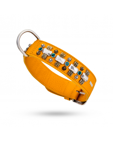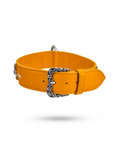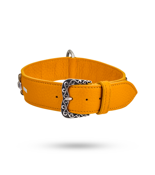 Bull leather made in Italy, waxed and brushed edges, Swarovski stones, chiseled buckle with an exclusive Malucchi design, silver hardware. Arrangement, quantity, and colors of the applications change to the color of the leather and to the size of the article.