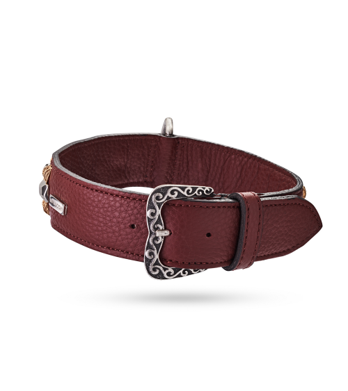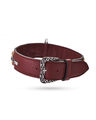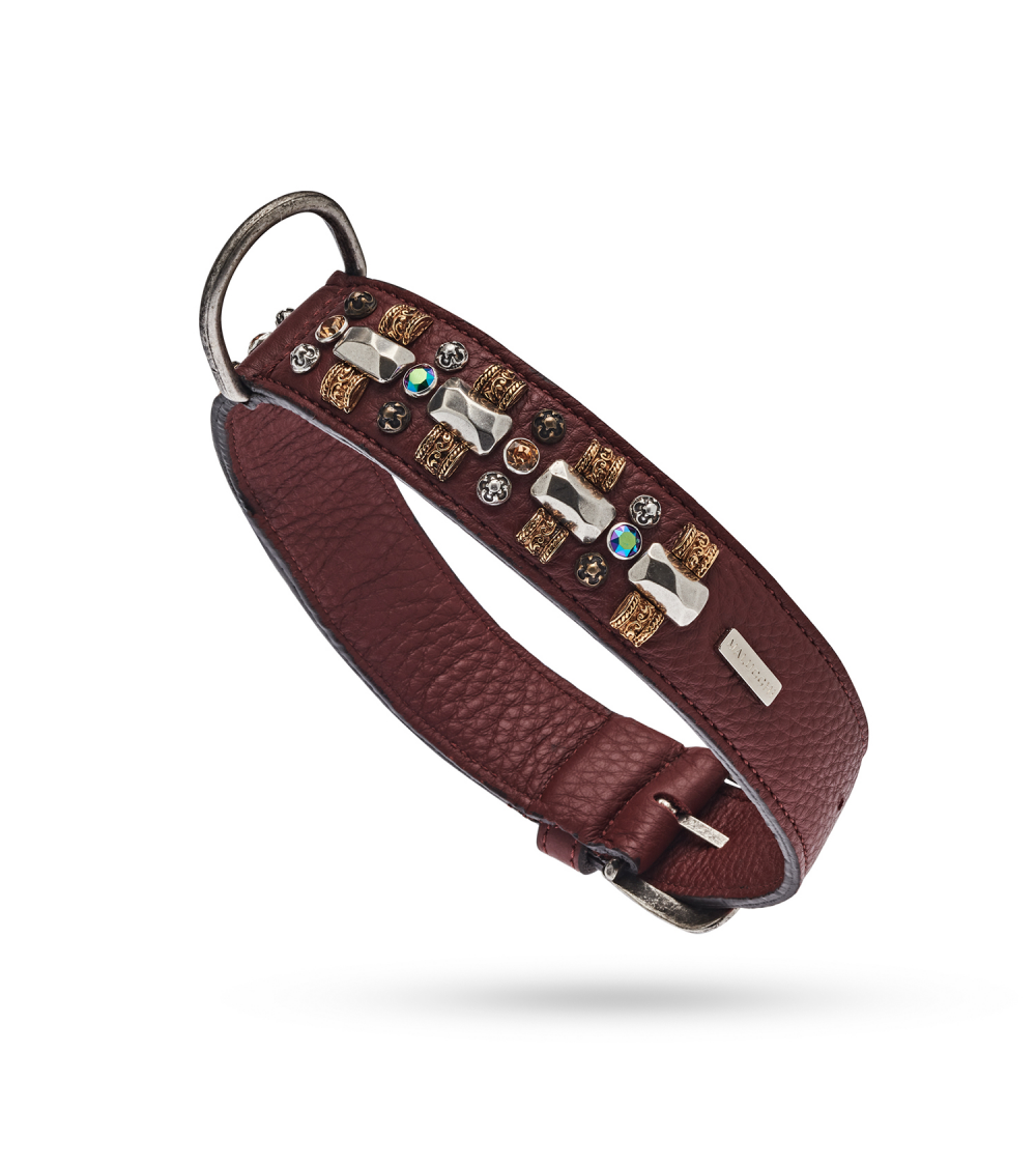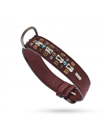 Bull leather made in Italy, waxed and brushed edges, Swarovski stones, chiseled buckle with an exclusive Malucchi design, silver hardware. Arrangement, quantity, and colors of the applications change to the color of the leather and to the size of the article.