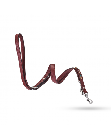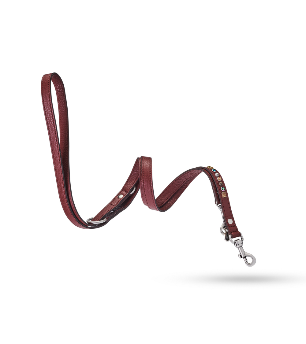 Bull leather made in Italy, waxed and brushed edges, Swarovski stones, chiseled buckle with an exclusive Malucchi design, silver hardware. Colors of the applications change according to the color of the leather of the article.