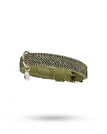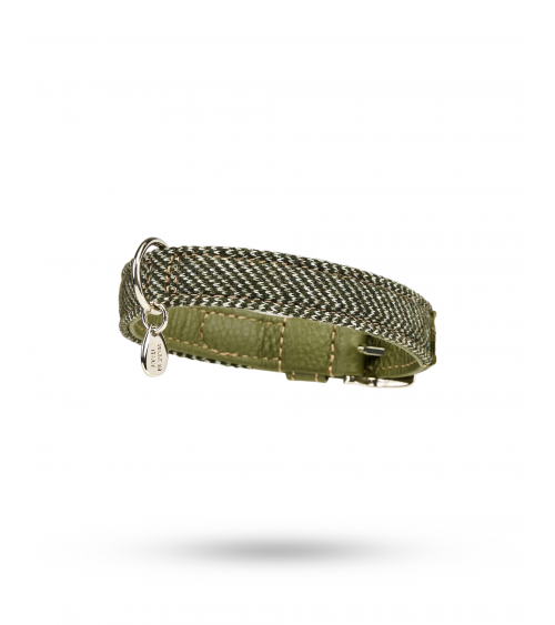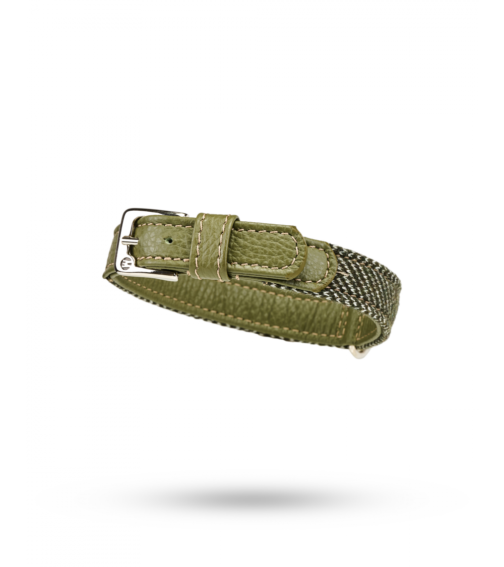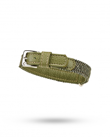 Morbido nastro in tessuto misto lana/cotone con trama Zig Zag Spigato colore verde. Fodera in morbida nappa di vitello. Impunture a contrasto colore ecrù. Minuteria in finitura palladio