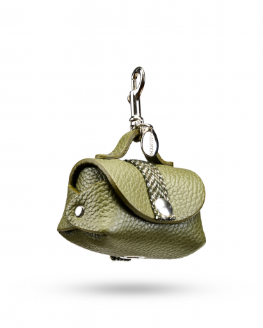 Struttura in morbida nappa di vitello, con dettaglio in tessuto misto lana/cotone con trama Zig Zag Spigato colore Verde. Impunture a contrasto colore ecrù. Minuteria in finitura palladio.
