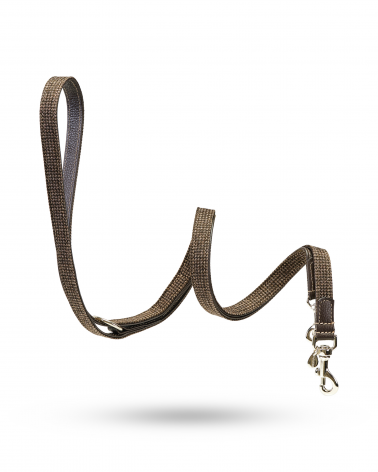 Morbido nastro in tessuto misto lana/cotone con trama Pied de Poule colore testa di moro. Fodera in morbida nappa di vitello di origine italiana. Impunture a contrasto colore ecrù. Minuteria in finitura palladio