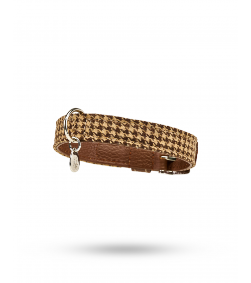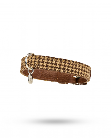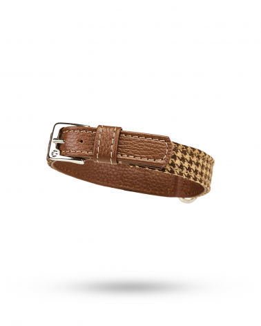 Morbido nastro in tessuto misto lana/cotone con trama Pied de Poule colore nocciola. Fodera in morbida nappa di vitello di origine italiana. Impunture a contrasto colore ecrù. Minuteria in finitura palladio