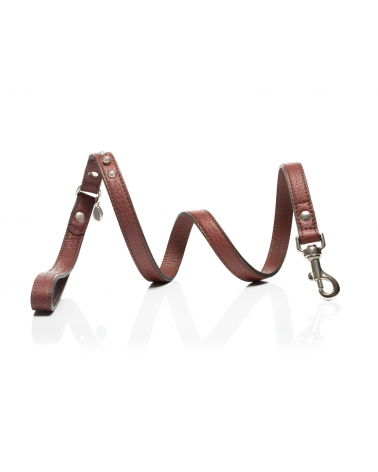 Pelle di toro realizzata in Italia, bordi cerati e spazzolati, finiture palladio.