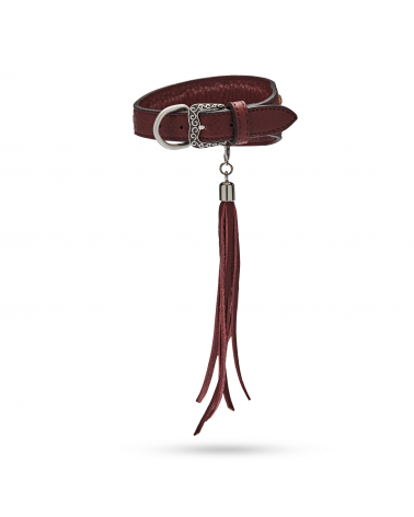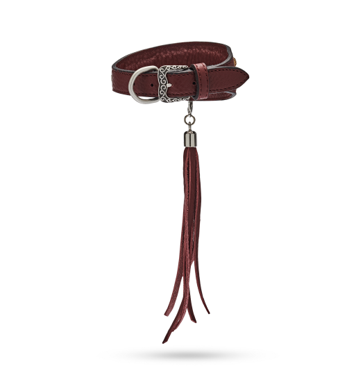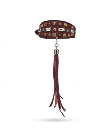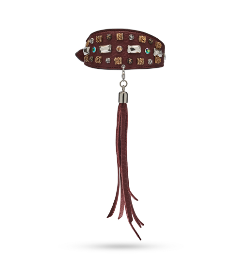 Pelle di toro realizzata in Italia, bordi cerati e spazzolati, pietre Swarovski, fibbia cesellata con un design esclusivo Malucchi, finiture argento. La disposizione, la quantità ed i colori delle applicazioni cambiano in base al colore della pelle e alla taglia dell'articolo.